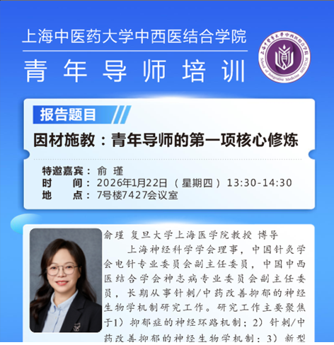 作为中西医结合一级博士学位点导师培训系列讲座之一,2026年1月22日特邀复旦大学上海医学院俞瑾教授,以“...